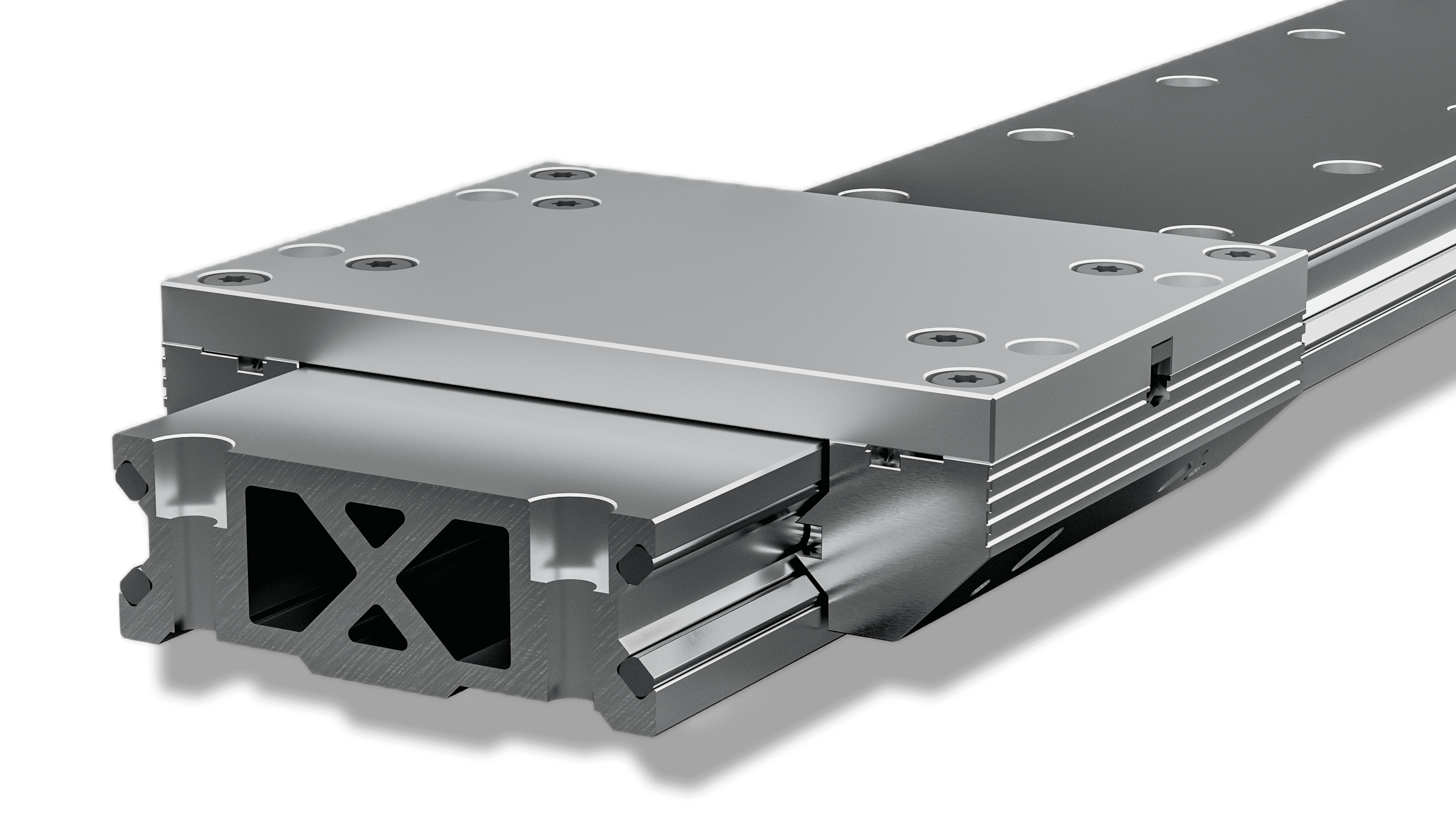 Accionamiento directo compuesto por un raíl ancho con banda magnética integrada y carro motorizado.